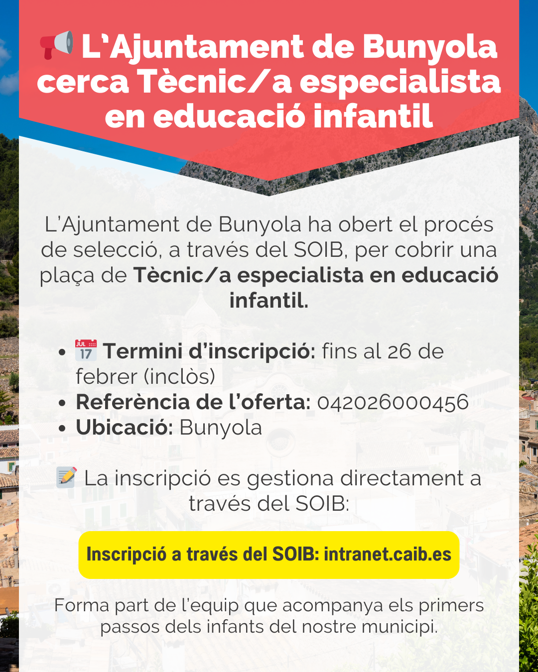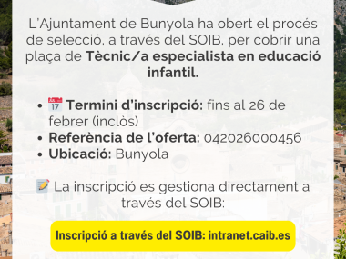 L'Ajuntament de Bunyola cerca personal per a la plaça de Tècnic/a especialista en educació infantil. T'agradaria treballar amb els més petits del nostre municipi?